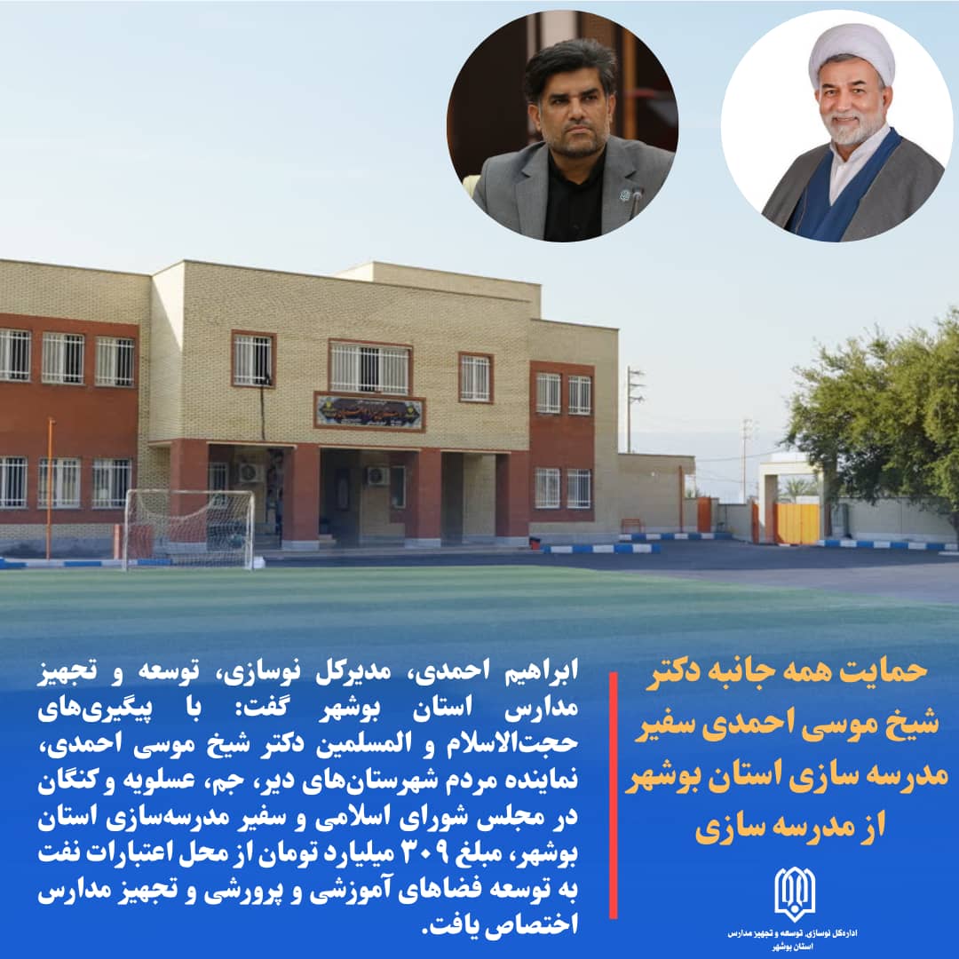 کرانه بوشهر: ابراهیم احمدی، مدیرکل نوسازی، توسعه و تجهیز مدارس استان بوشهر گفت: با پیگیریهای حجتالاسلام و المسلمین دکتر شیخ موسی احمدی، نماینده مردم شهرستانهای دیر، جم، عسلویه و کنگان در مجلس شورای اسلامی و سفیر مدرسهسازی استان بوشهر، مبلغ ۳۰۹ میلیارد تومان از محل اعتبارات نفت به توسعه فضاهای آموزشی و پرورشی و تجهیز مدارس اختصاص یافت.