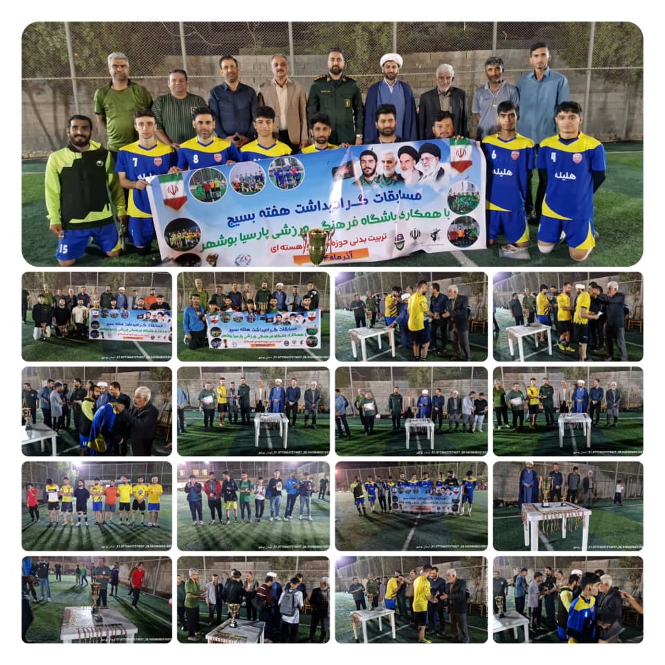 مراسم اختتامیه با حضور سروان پاسدار ابراهیم جاهد بوشهری فرمانده حوزه شهدای هستهای، آقای پیمان نوروزیزاده رئیس اداره ورزش و جوانان شهرستان بوشهر و جمعی از مسئولین و بسیجیان همراه بود. در این آیین، از تیمهای برتر تقدیر و جام قهرمانی به پایگاه شهید محمود انصاری اهدا شد.