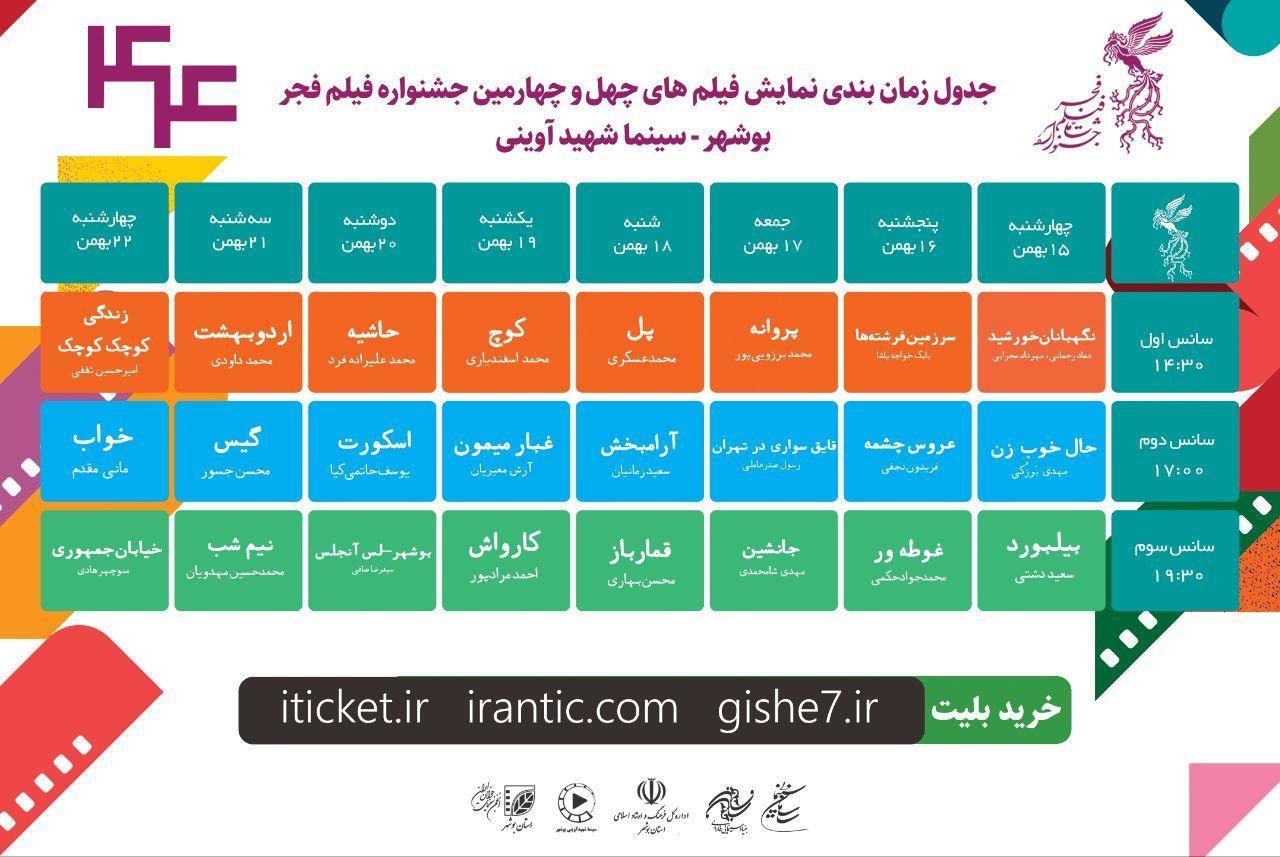 انتشار جدول زمانبندی پخش فیلمهای چهل و چهارمین جشنواره فیلم فجر ویژه استان بوشهر